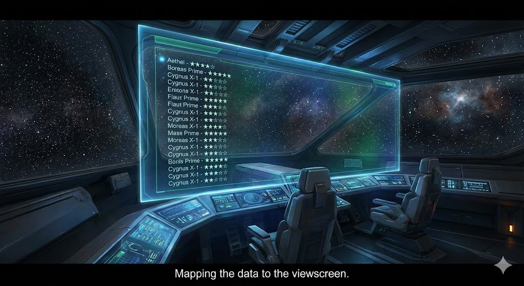 The Story: The ship’s main viewscreen is dark. Ava runs a command to “Map” her data onto the screen. Suddenly, rows of glowing text appear, describing every world she’s visited in human-readable language.