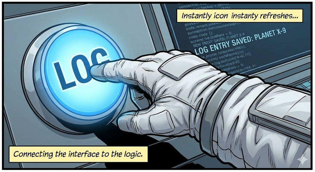 The Story: Ava installs a physical “Log Discovery” button on her desk. She wires it so that every time she hits the button, the ship’s computer listens, grabs the data from her keyboard, and updates the display.